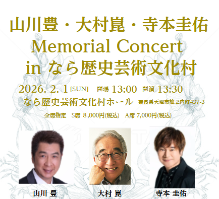 令和8年2月1日(日) 山川豊・大村崑・寺本圭佑 Memorial Concert ㏌ なら歴史芸術文化村